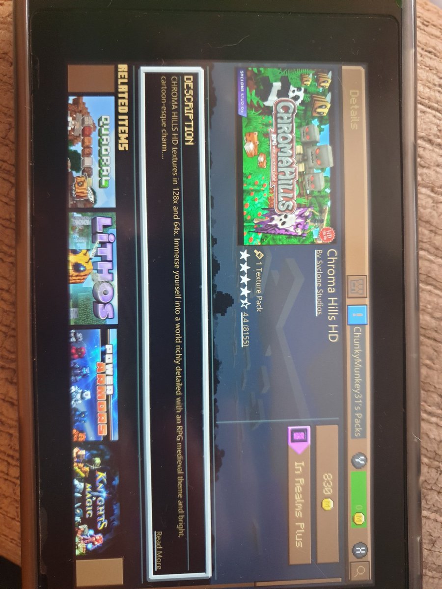 @MojangSupport Hi, I hadn't been on my minecraft (switch edition) in about 8 months, i fully updated it, went to check my owned texture packs and my @ChromaHills pack is showing as not purchased in the store and "missing" when I'm in game, images attached, thankspic.twitter.com/2aESsqYyrw