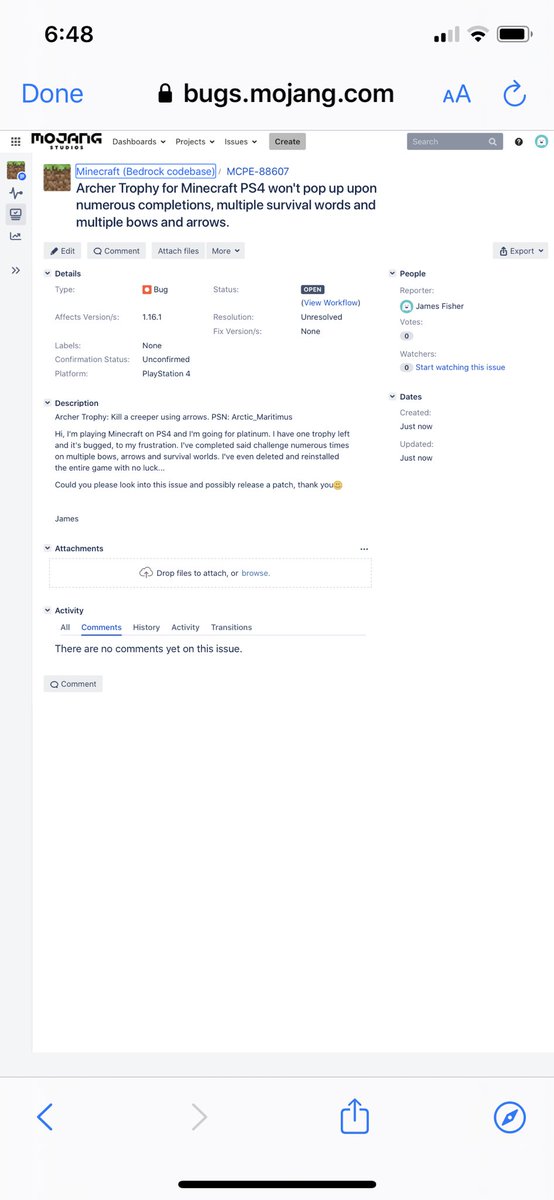 @MojangSupport hi, I’m playing Minecraft PS4 and trying to get platinum. However, the Archer achievement is bugged and won’t pop up. I’ve killed creepers like 30+ times now with arrows on a bow, crossbow, sword and bow and done multiple survival worlds, it just won’t pop up??