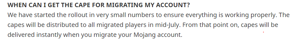 @MojangSupport Hello, I recently migrated my Premium Minecraft account to Microsoft, but I wasn't awarded with the cape yet in around within 8 or so hours. Is the reward not been given towards the user/broken or it will be given at some specified time?