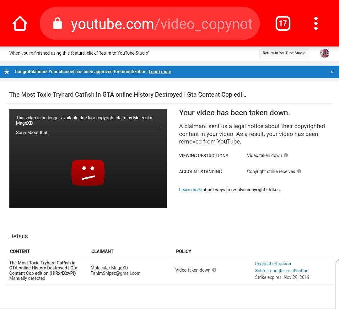 @TeamYouTube this may be crazy but can you spend at least like 10 seconds on a copyright strike? Someone filed a take down complaint pretending to be me on my video. Makes sense?pic.twitter.com/nZuI0wliUR
