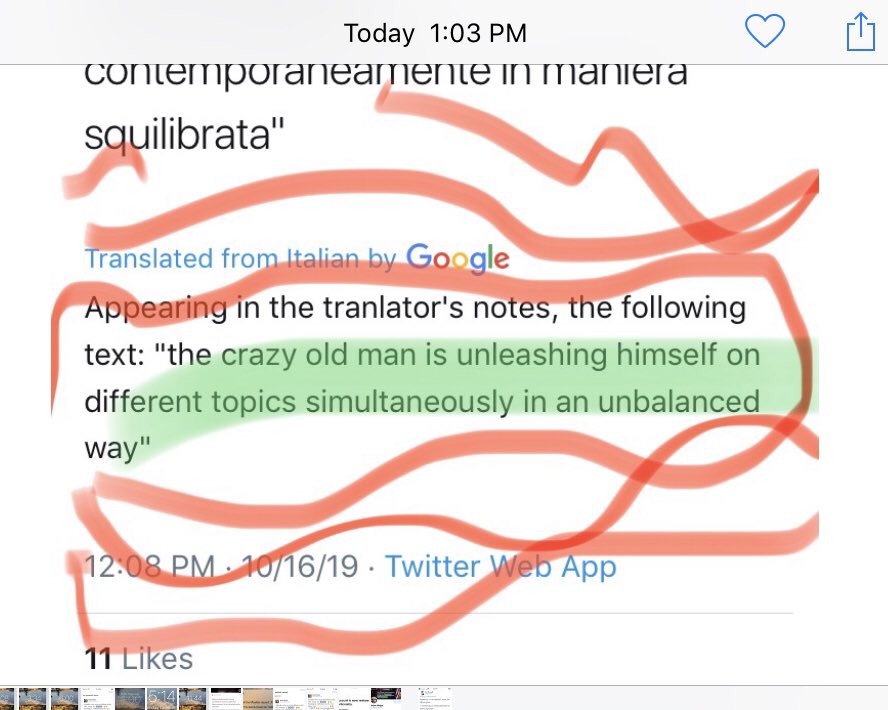 Appearing in the tranlator's notes, the following text: "il vecchio pazzo si sta scatenando su diversi argomenti contemporaneamente in maniera squilibrata"