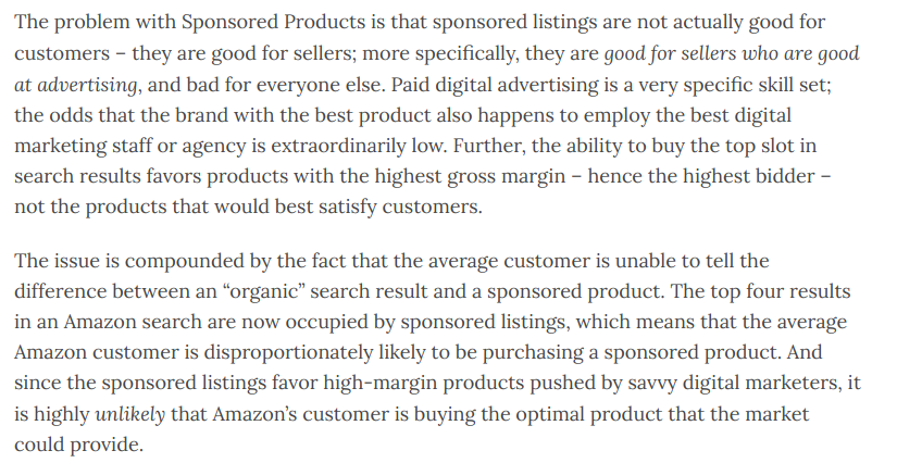 @zackkanter's essay on Amazon & its Sponsored Listing misstep. Amazon feels broken today. Sponsored listings suck & I use@FakespotReviews constantly. You don't need competitors or the govt to kill Amazon. Amazon can kill itself. https://zackkanter.com/2019/03/13/what-is-amazon/ …pic.twitter.com/Jt8lkXoA7q