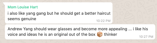 Hey @AndrewYang, my mom says she likes you but that you should get a better haircut. #YangGang #Yang2020pic.twitter.com/glfD2tyLuh