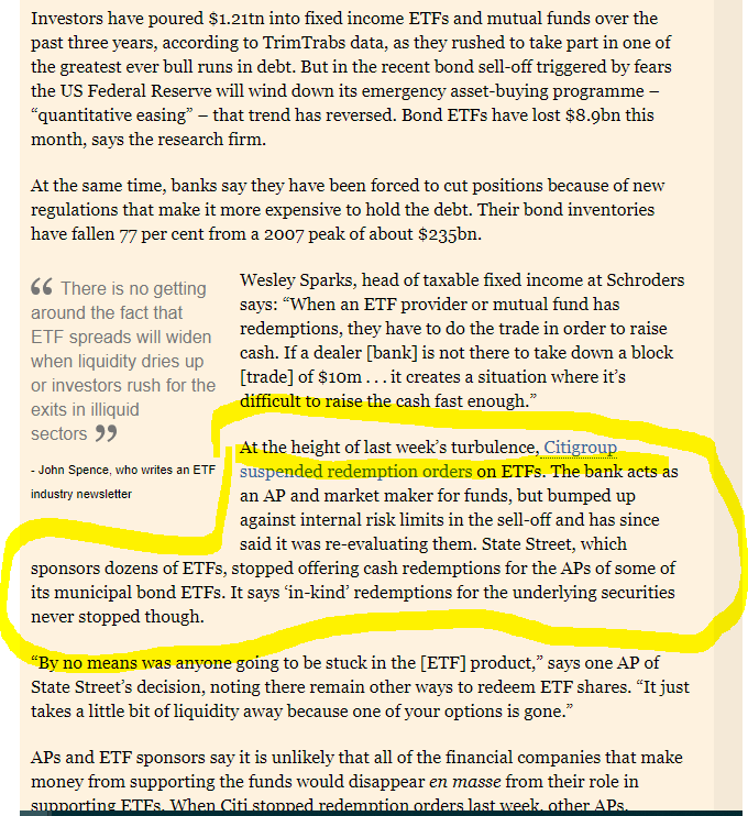 Does anyone know how, say Blackrock, issued ETFs on illiquid assets can unravel? 1. People lose faith in it's convertibility or issuer 2. It starts to trade at a discount to underlying assets 3. People attempt to convert the ETF back with Blackrock, who can't b/c illiquidity?