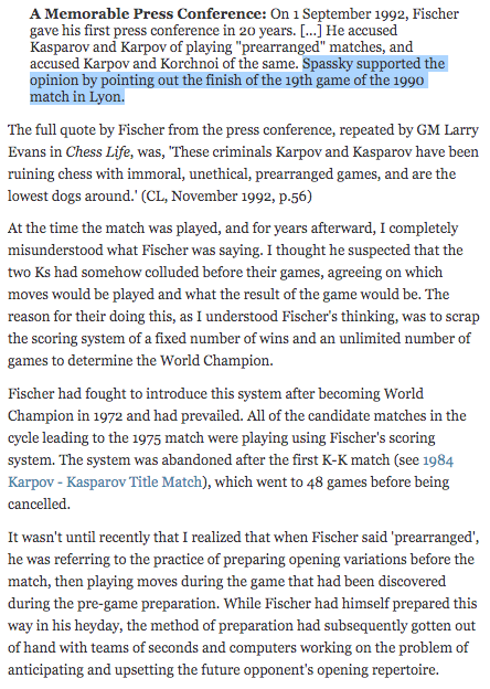 That Kasparov and Karpov fixed their 1984-5 matches isn't by the way just a "conspiracy theory" of Fischer's ...it's been suggested by others including his opponent Spassky and the explanation is almost worse than if they had "colluded" in secret: http://chessforallages.blogspot.com/2008/09/ruining-chess-with-prearranged-games.html …pic.twitter.com/UBngreB8F1