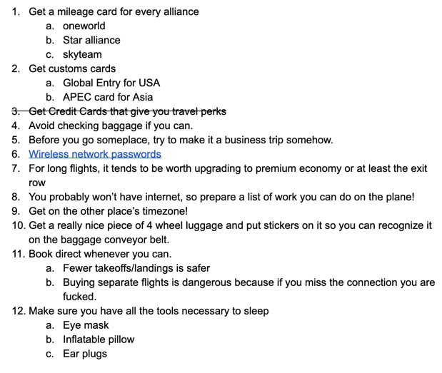 I travel a lot. This is my checklist for how to fly. Did I miss anything? I've crossed out travel credit cards because I believe that they are more trouble than they're worth and recently demand has exceeded supply resulting in long lines at many airport lounges.pic.twitter.com/Rg9sC6ebDA