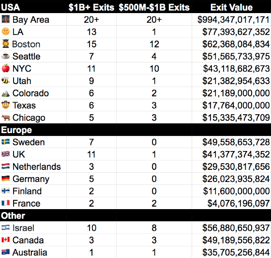 Joseph Flaherty @josephflahertyThe Bay Area has produced the most/biggest startup exits. However, over the last ten years, there's been over a hundred $1B+ tech exits outside of the Valley.@dafrankel and I dug into the "startup geography" data and came away with some surprises: https://medium.com/@foundercollective/startup-success-outside-silicon-valley-data-from-over-200-exits-in-17-cities-1872bf8e7619 … pic.twitter.com/ywu8QZf5HU2 replies 1 retweet 34 likesShow this thread -