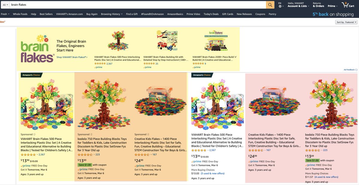The State of Amazon Search in 2020 This is a search for Brain Flakes, our registered trademark. The yellow section requires us to pay a fee to Amazon in order to appear. The red are other companies we've sued for trademark infringement. Orange is sponsored infringing productpic.twitter.com/T3nc0ziqSn