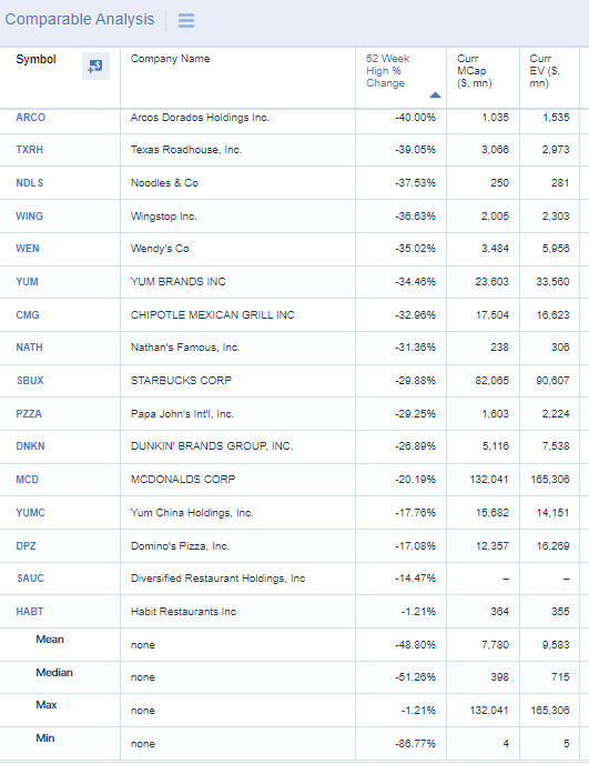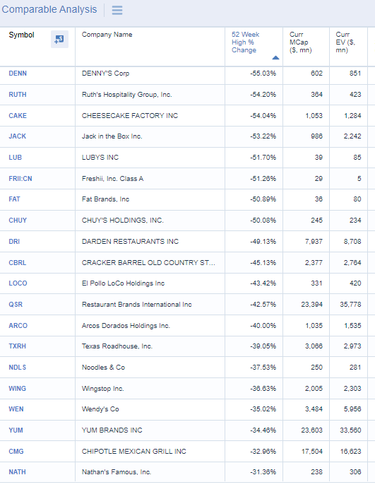 the median restaurant in my watchlist is down 51% from the 52w high. $HABT is being acquired by $YUM so don't look at that.pic.twitter.com/nrzz1qzS5G