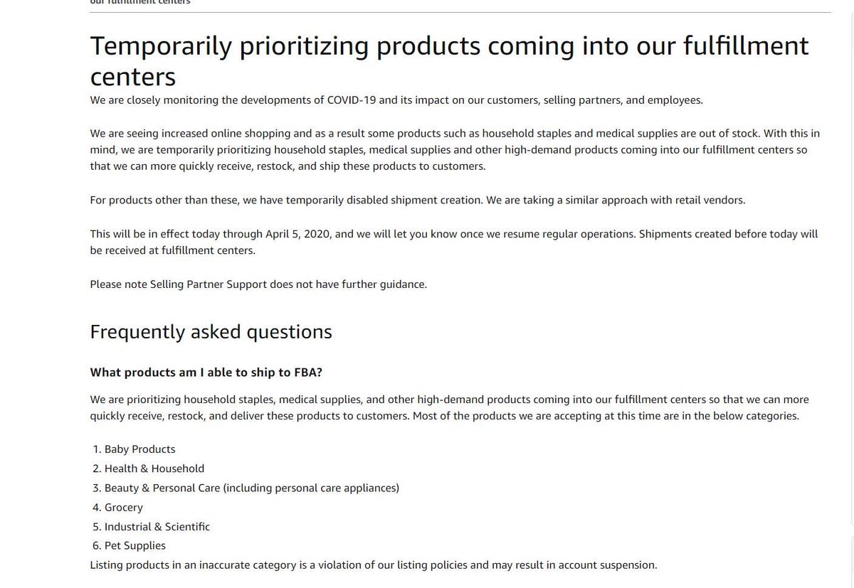 Amazon limiting replenishments into their fulfillment network to high demand needed productspic.twitter.com/V45ZfY9qt7