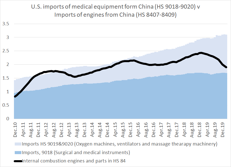 This sort of surprised me -- U.S. imports from China in the HS category that includes ventilators (and other respiratory machines, including oxygen machines) haven't been significantly impacted by the trade war. 1/xpic.twitter.com/4RbMLZ4nG6