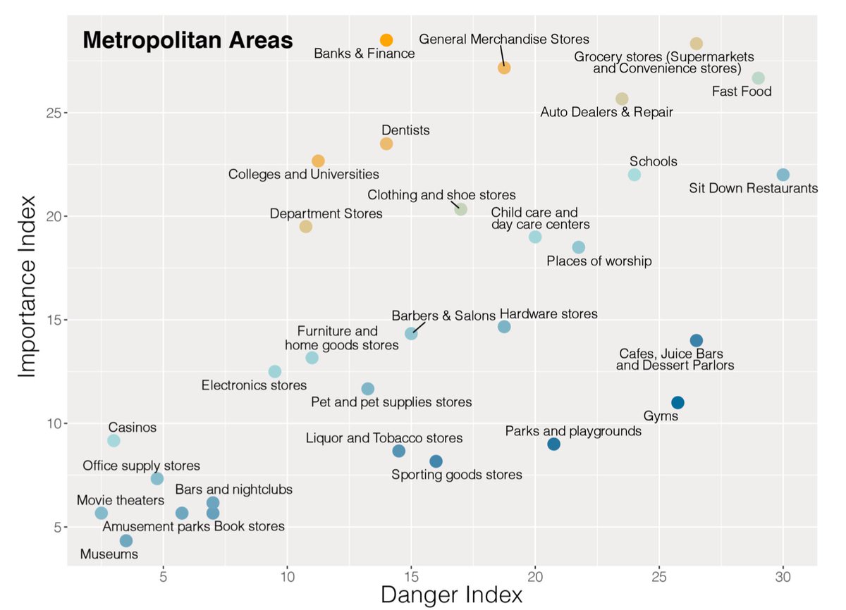 Interesting in predicting what's coming back first in reopening. https://twitter.com/SafeGraph/status/1252016247044214785?s=20 … Movie theatres seem higher in the danger factor than that, I think.