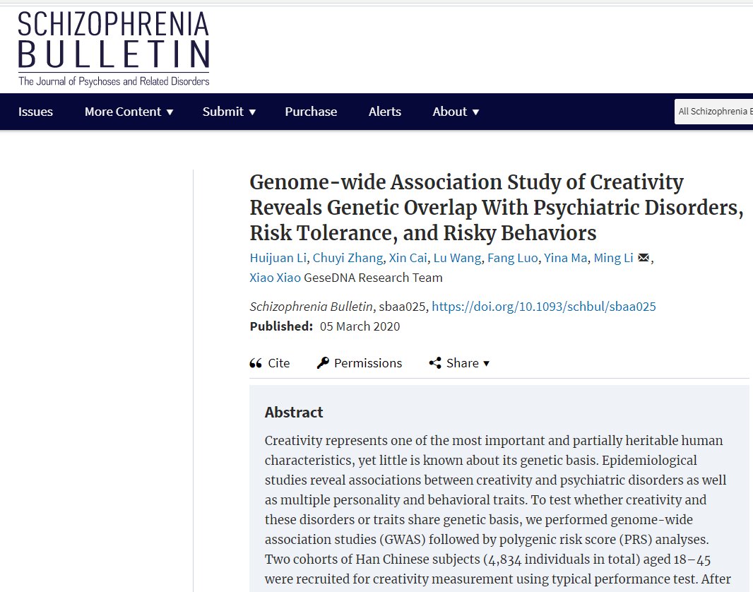 Stereotype accuracy confirmed again: The unstable creative type. There are correlations at the genetic level between (a) creativity, (b) mental instability (schiz, depression), and (c) risk-taking. https://academic.oup.com/schizophreniabulletin/advance-article-abstract/doi/10.1093/schbul/sbaa025/5781181 …pic.twitter.com/Zb0BGm0bTd