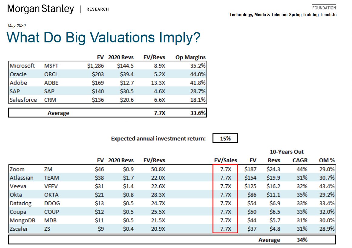 Interesting way to look at the embedded 10 year growth assumptions of some of today's high multiple SAAS co's. 34% CAGRs and $10-$20B in revs is not unpossible but lots of execution between here and there. pic.twitter.com/oUotGkp8Pp