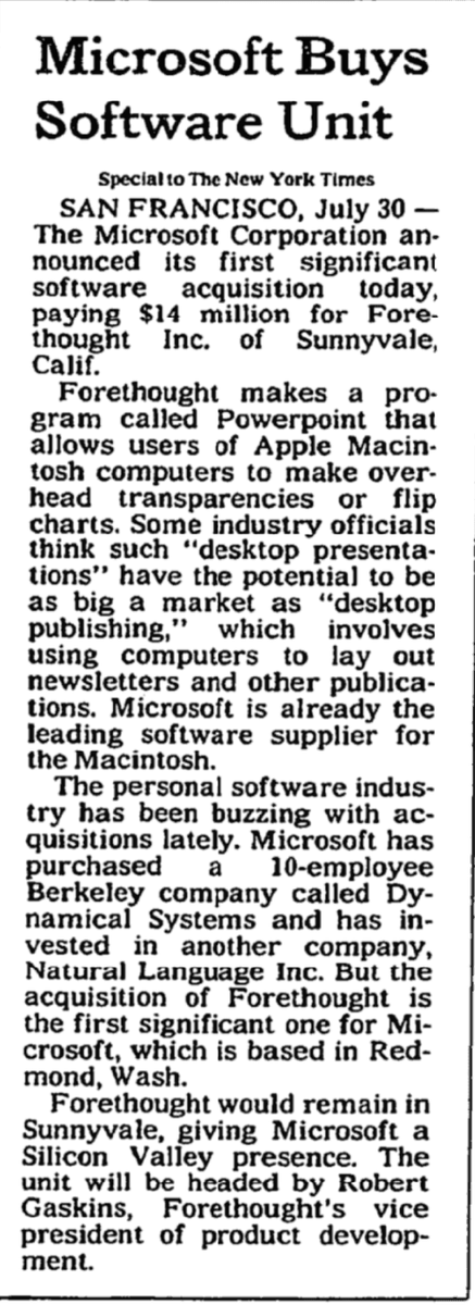 NY Times July 30, 1987: - Microsoft buys Forethought, maker of PowerPoint, for $14M in cash Today: - PowerPoint has 500M users - Microsoft Office is $30B+ revenue per year - $14M of Microsoft stock from July 1987 would be worth ~$10B todaypic.twitter.com/dA3um1vqDI