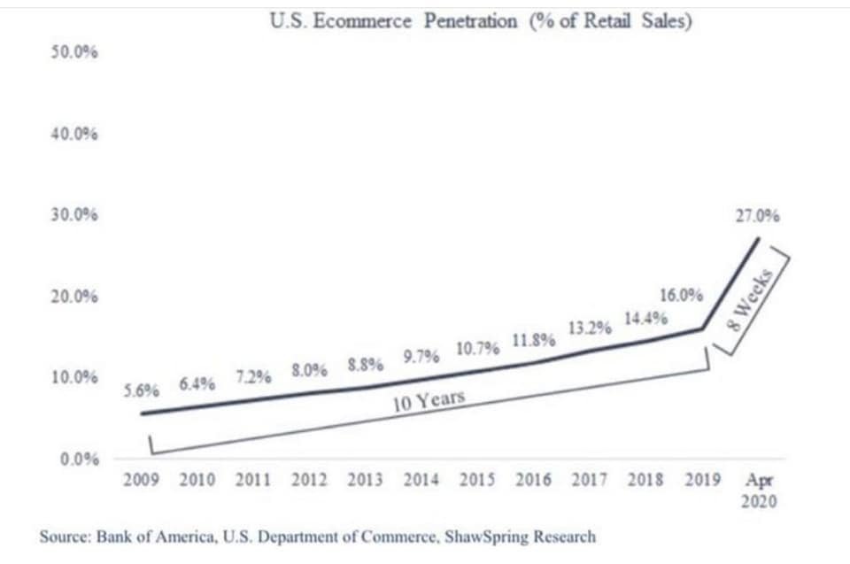 US Ecommerce Penetration as a % of Retail Sales (N.B. retail sales includes purchases of many products that are rarely purchase online, such as gasoline, cars, perishable food, etc.)pic.twitter.com/hMZy3VOPm3