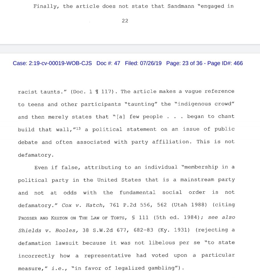 I believe the judge also found that "racist" is an opinion that can't create liability for defamation, although I read it several months ago. Will look up the excerpt. 2/2