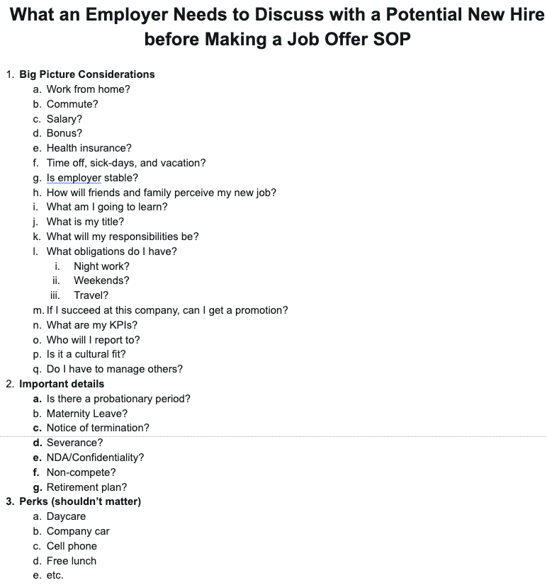 The big picture considerations that go into whether or not you should accept a job: 1. Work from home? 2. Salary? 3. Bonus? 4. Health insurance? 5. Time off & vacation? 6. Is employer stable? 7. How will friends and family perceive my new job? 8. What am I going to learn?