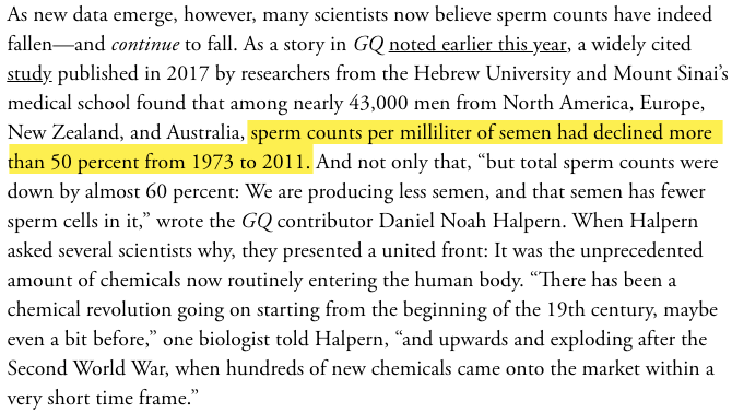 What's the cause? I feel like some anonymous twitter account with an anime avatar knows the answer. A lot of people say BPA and phthalates but its not clear to me where that exposure would be coming from. Drinking water? https://www.theatlantic.com/family/archive/2018/10/sperm-counts-continue-to-fall/572794/ …pic.twitter.com/fpboYySIib