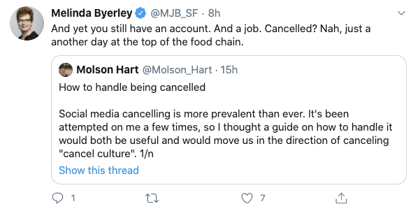 How to handle being cancelled Social media cancelling is more prevalent than ever. It's been attempted on me a few times, so I thought a guide on how to handle it would both be useful and would move us in the direction of canceling "cancel culture". 1/n
