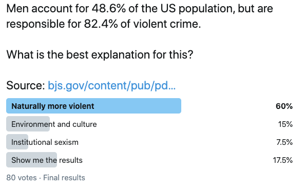 The poll options were analogous to explanations used in the charged debate on race and crime, i.e. systemic racism, environment, and racist genetic destiny. It's interesting to see how people vote when they're anonymous and thinking about a less controversial topic: