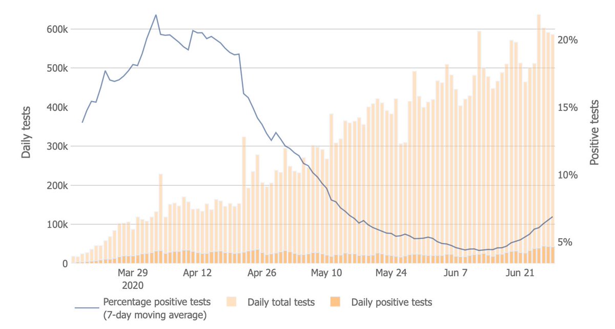 新冠确诊病例年轻化应该是有多方面的原因,但个人认为最主要的原因还是检测条件放宽了,更多的轻症也能去检测了。相应地,去检测的年轻人也增加了 4月初美国单日检测量10万,阳性率20% 6月份美国单日检测量50万,阳性率5%pic.twitter.com/nHYZEDloHu