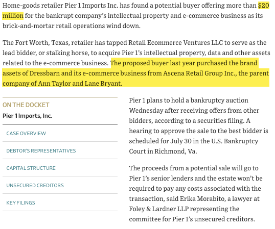 In what world is Pier 1's e-commerce business and branding worth $20 million dollars. That's not even the agreed price, that's just the opening bid of an auction. Just another stupid private equity company with too much money.pic.twitter.com/9tTTORWnOJ