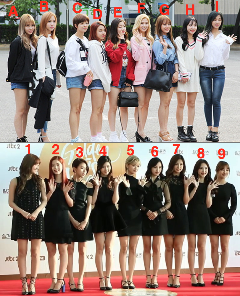 Same K-pop girl group, different photo. Can you match the singers in each photo? For example, H is #8 in the second photo.pic.twitter.com/vaiE2x79xH