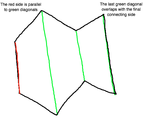 Very candidly, I simply do not understand your rounding argument. In your diagram, where do you get n-1? There are four seemingly parallel segments, two of which are sides (that's why I once mentioned a second side.) There are n-2 diagonals