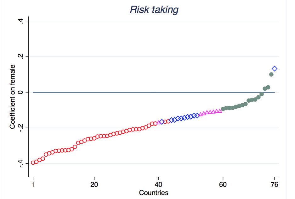 Interesting gender differences across countries. In most countries, women are less risk seeking. Red dots are significant differences. cc @SteveStuWillpic.twitter.com/8DBQ0cXg5R
