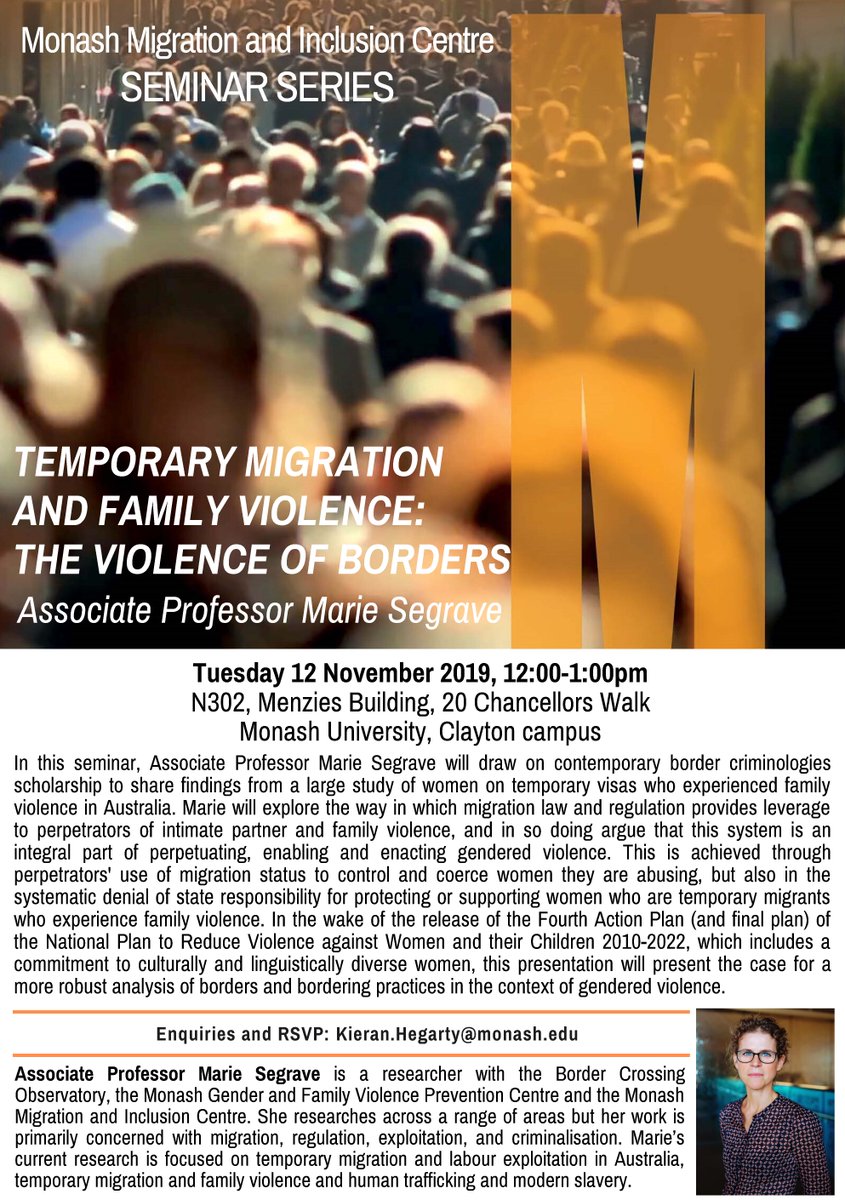 @MSegrave will share findings from a large study of women on temporary visas who experienced family violence in Australia, revealing how flaws in existing laws & regulations enable & perpetuate violence against migrant women. RSVP here: http://bit.ly/2MSrLu7 pic.twitter.com/p1zyQWQGIl