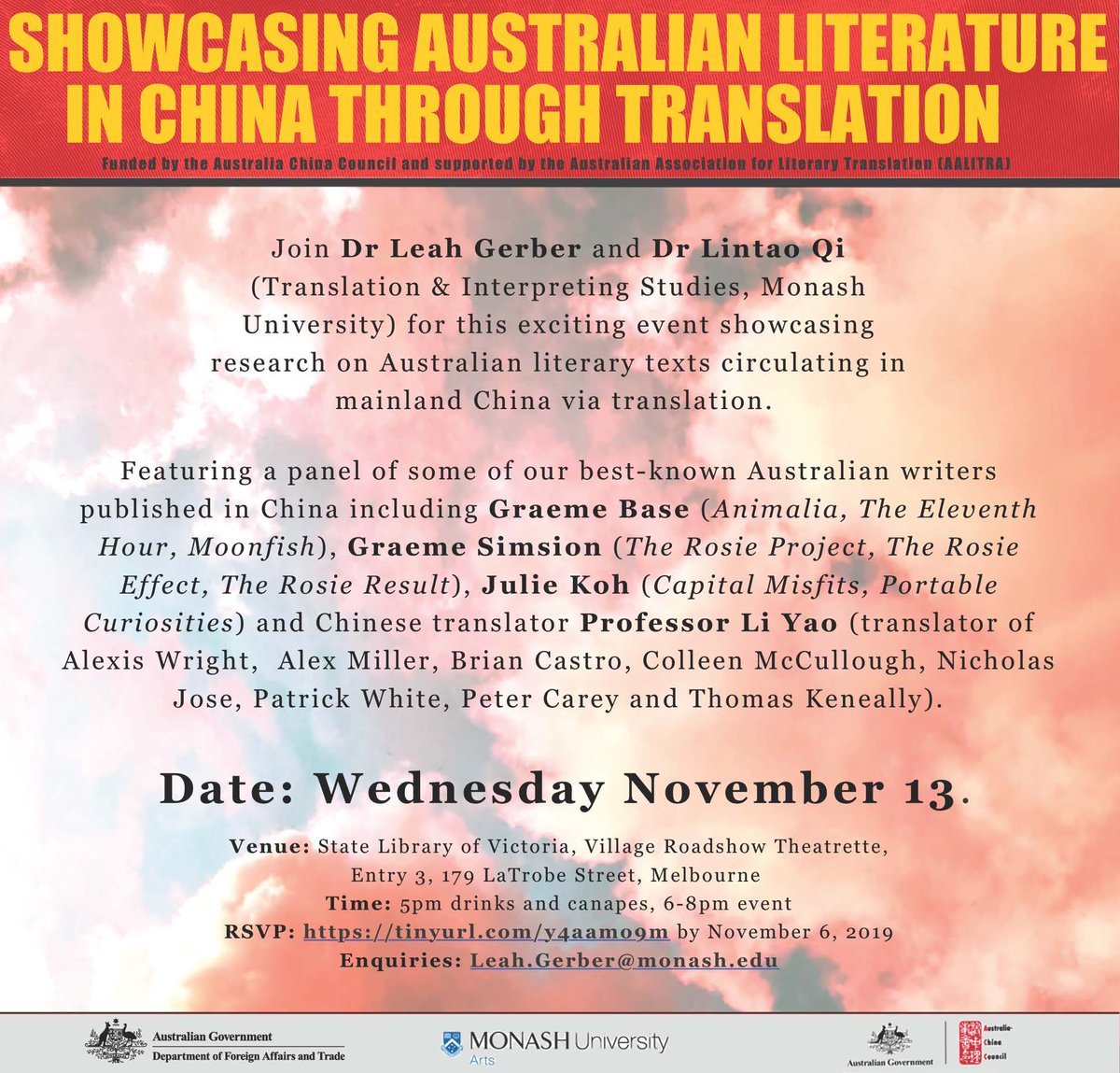 @LintaoQ@Library_Vic as they explore the Australian literary texts circulating in China via translation alongside a star-studded panel of authors including Graeme Base,@GraemeSimsion,@juliekoh, & translator Prof Li Yao. Book now: https://tinyurl.com/y4aamo9m pic.twitter.com/Lv0w7tBm5l