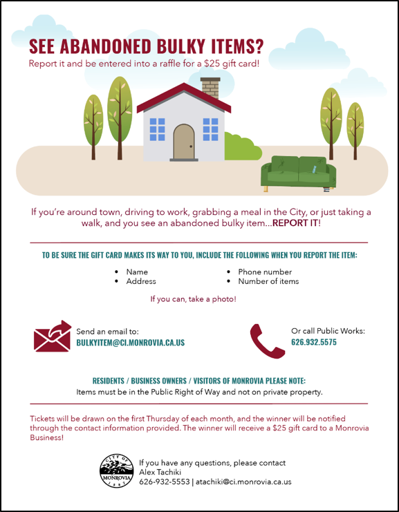 From abandoned couches, to mattresses, to tables … if you see any bulky item trash sitting on a sidewalk, let us know by sending an email to bulkyitem@ci.monrovia.ca.uspic.twitter.com/HUHj19Rcra