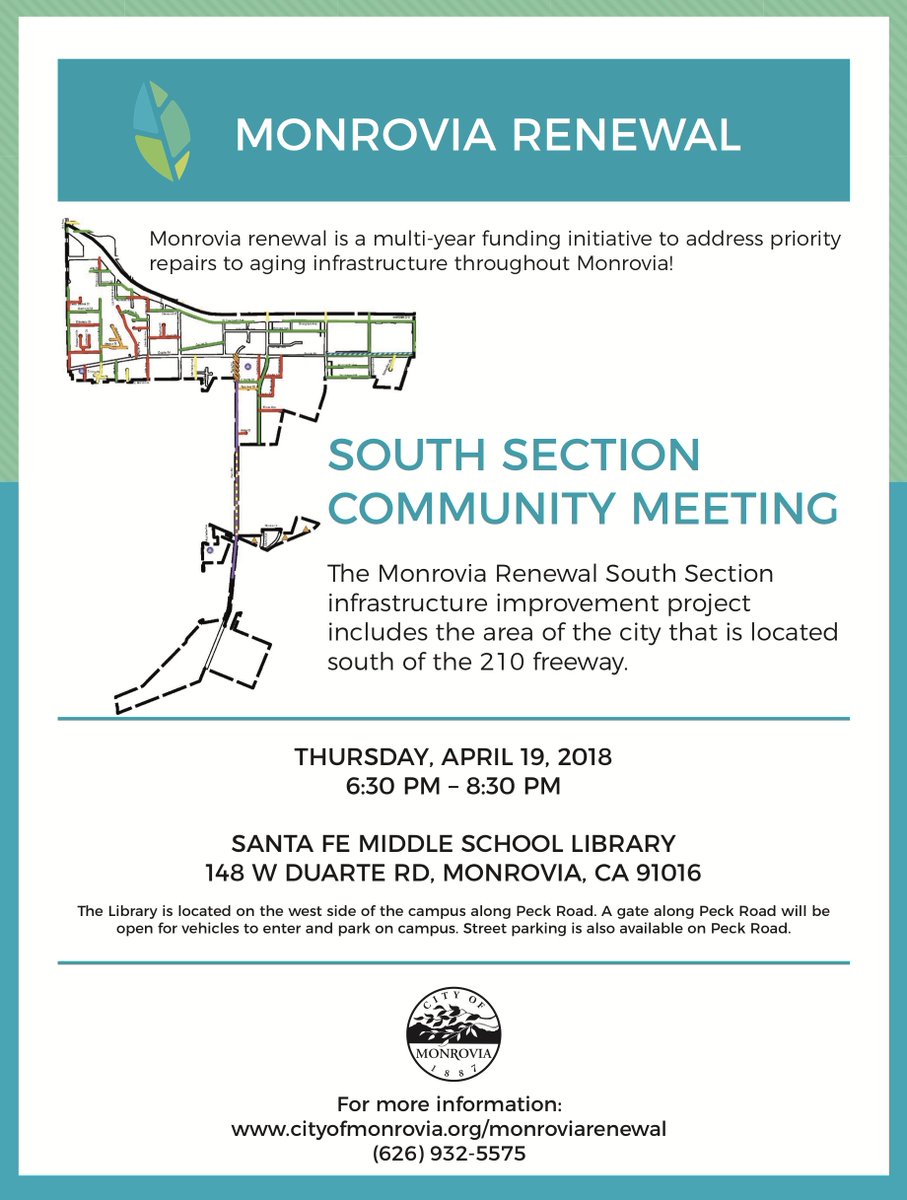 Monrovia Renewal construction work is headed to the South section of town! Join us at the Community Meeting to learn more.pic.twitter.com/VaSmJp64Oj