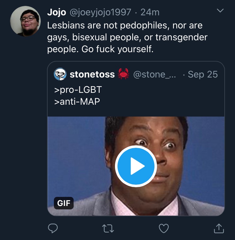 Maybe I'm sick of twitter allowing a white supremacist to project his disgusting bigotry without consequence? But just maybe.