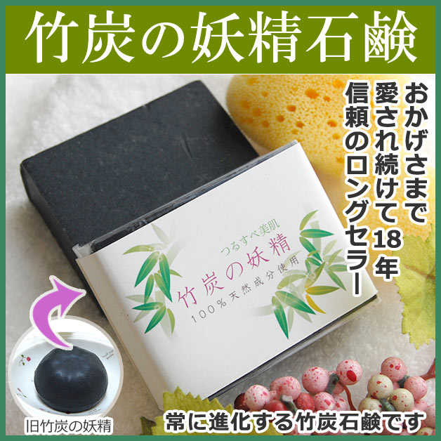 竹炭の妖精石鹸 竹炭配合でくすみ・ザラつきなどの 古い角質を優しく分解し、透明感のある しっとりとしたお肌へ導きます。 特許取得の竹酢液配合 リニューアルしながら 17年前から販売してる人気商品です。