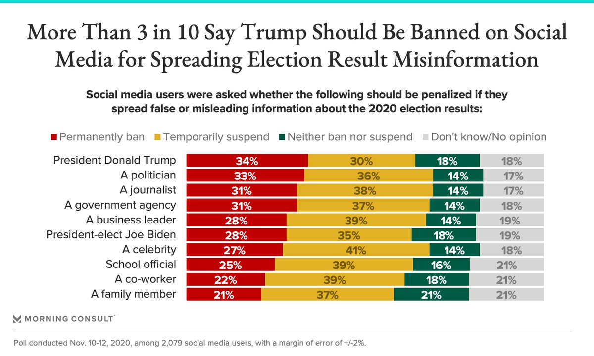 34% of social media users said Trump should be banned from platforms whenever he shares disinformation about the election results — the highest share among the list of figures included in the survey. https://bit.ly/35N35ws pic.twitter.com/swGtQcvTcy