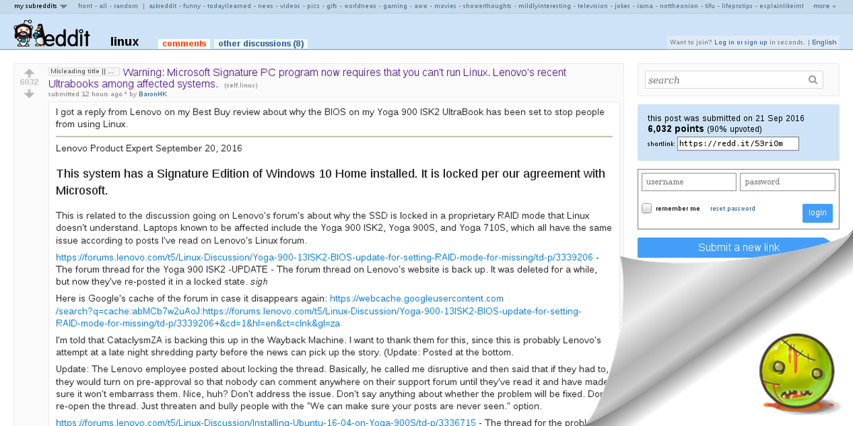 «Linux banned in MS Signature PCs. Lenovo among affected systems»— "System locked per our agreement with Microsoft"➜ https://www.reddit.com/r/linux/comments/53ri0m/warning_microsoft_signature_pc_program_now/ …pic.twitter.com/K7YAabpXMC