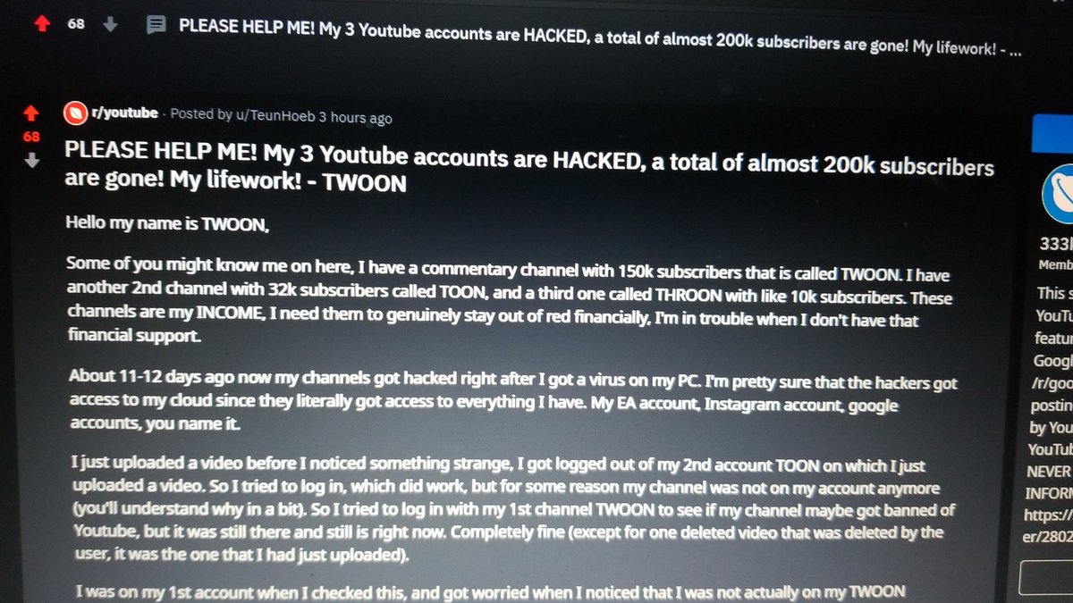 @KEEMSTAR @TeamYouTube @YouTube TWOON was hacked. He's lost all 3 accounts. Can you help this man get his accounts back ASAP!. This is his livelyhood! He's a commentary channel.pic.twitter.com/wvhiwtsba6