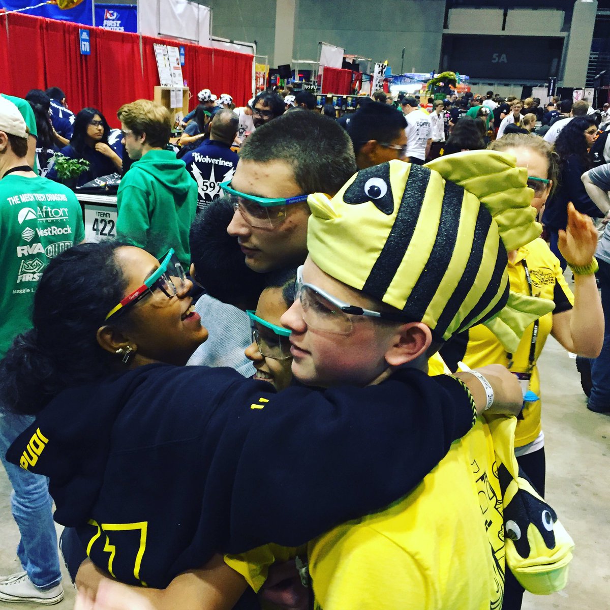 Drive team and alliance captain's group hug after we got picked! #CelebrationSaturday @FIRSTweets @FIRSTMidAtlpic.twitter.com/wNzMibP7Am