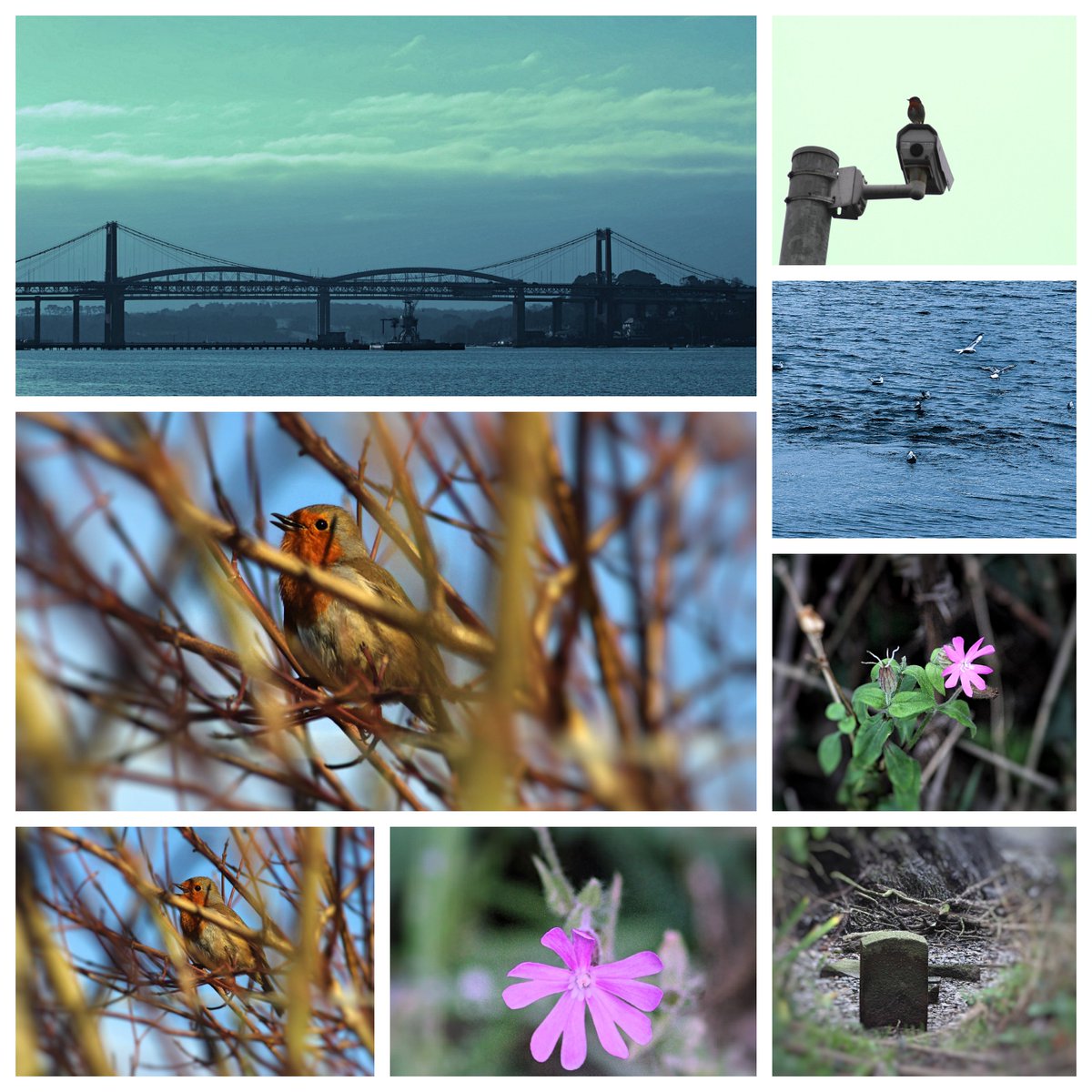 Ernesettle Headland Path on New Year's Day. Tamar Bridge, MoD boundary marker by the lookout point, Robins and Red Campion still in flower.