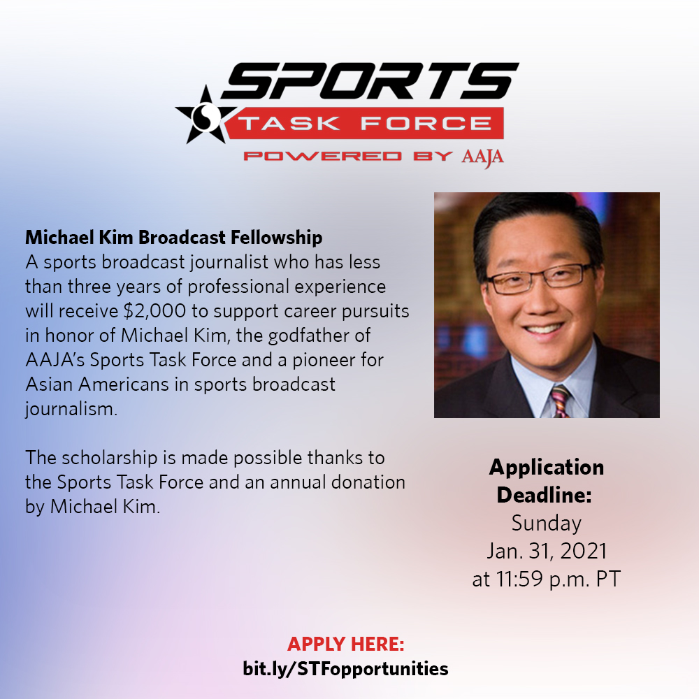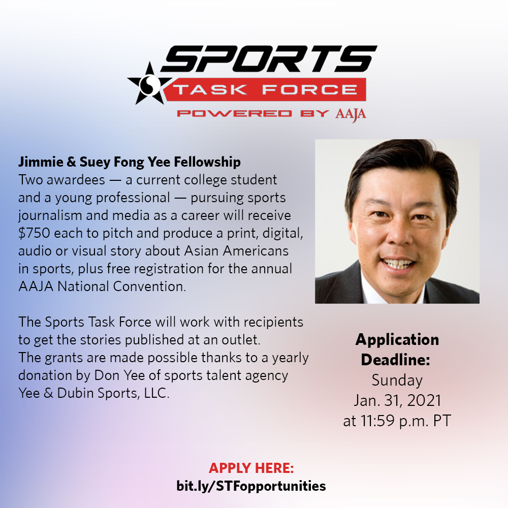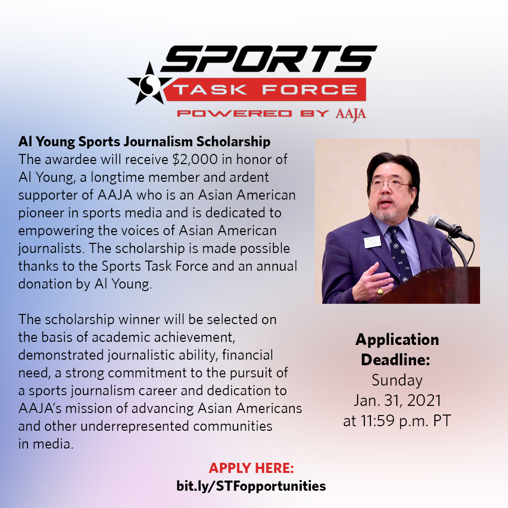 @AAJAsports is extremely proud to announce the following 3 scholarships all together worth OVER $5K (!!!) for 2021. If you're an AAPI young professional or student, THIS IS FOR YOU!! ! Deatils below and link to apply: http://sportstaskforce.com/opportunities/ pic.twitter.com/59K9xvTAwq