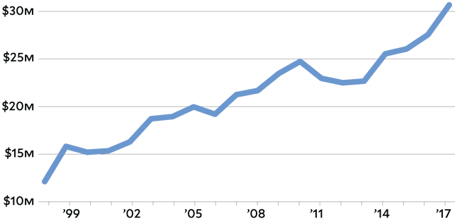 15/ Alcohol industry lobbying to make alcohol cheaper and more readily available has been on the uptick since the late ‘90s. Here are the millions of dollars the industry has spent, according to @OpenSecretsDC.pic.twitter.com/6h9Ps3c50s