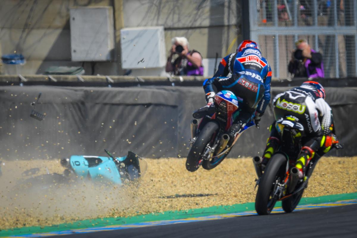 Sometimes, you just got to SEND IT! 🚀 @JakubKornfeil84 goes BIG in the craziest save in #Moto3 history! #FrenchGPpic.twitter.com/VnSPFB7Jlf