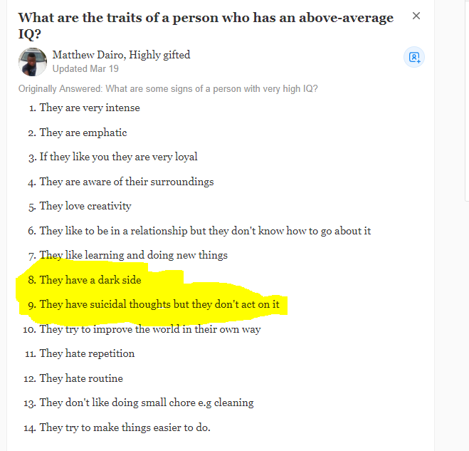 still more peak quora. note the highlighted portions in re the "gifted": "8. They have a dark side 9. They have suicidal thoughts but they don't act on it"pic.twitter.com/ScBHOfgvHT