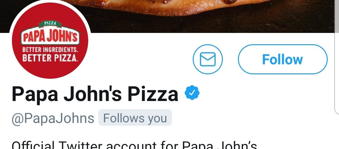 Glad to see @PapaJohns doing the work of following me. Here for it. I stan all the brands and have great engagementpic.twitter.com/OlseeBVebS