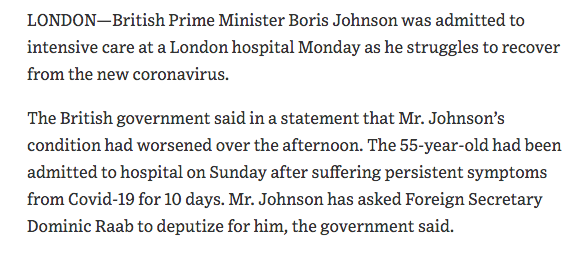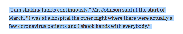my money was on "Pope" or some other religious leader going first, esp. given the advanced ages of most religious shamans/witch doctors/hierophants and the foot-washing/pustule-kissing traditions of many faiths, but it seems like BoJo is at the "Head of the Class"