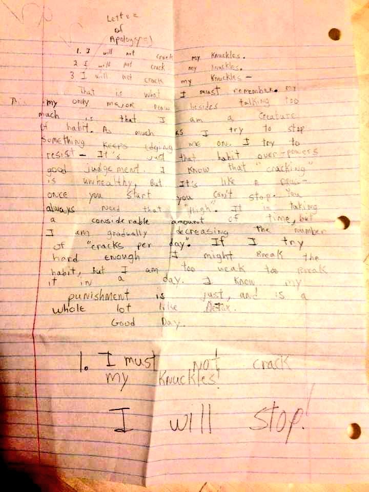 An important part of my homeschool curriculum was writing overwrought apologies to my mom for violating her rules about chewing gum, cracking knuckles, leaving the toilet seat up, and forgetting to use the safety scissors. I wrote this letter in Feb 92, 2 mos before turning 10pic.twitter.com/LJhkfRg8OT