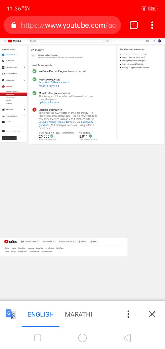 My channel is complete the 4K hours watch time and 1K subscribers in previous 365 days and still my channel monitization is not enable guide movies fun ushttps://www.youtube.com/channel/UC7pCA4XqtrBQVQ6dmqvdClQ