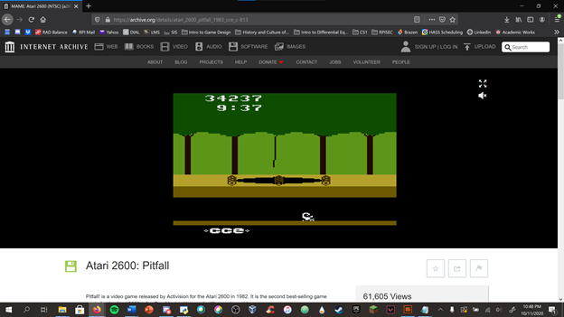 Part of this class requires us to look at older videogames, play them, and then analyze them. This is where Activision and you, Mr. Crane, come in. For my assignment I worked on a few days ago, I stumbled upon Pitfall! for the Atari 2600 and decided to play and analyze it.